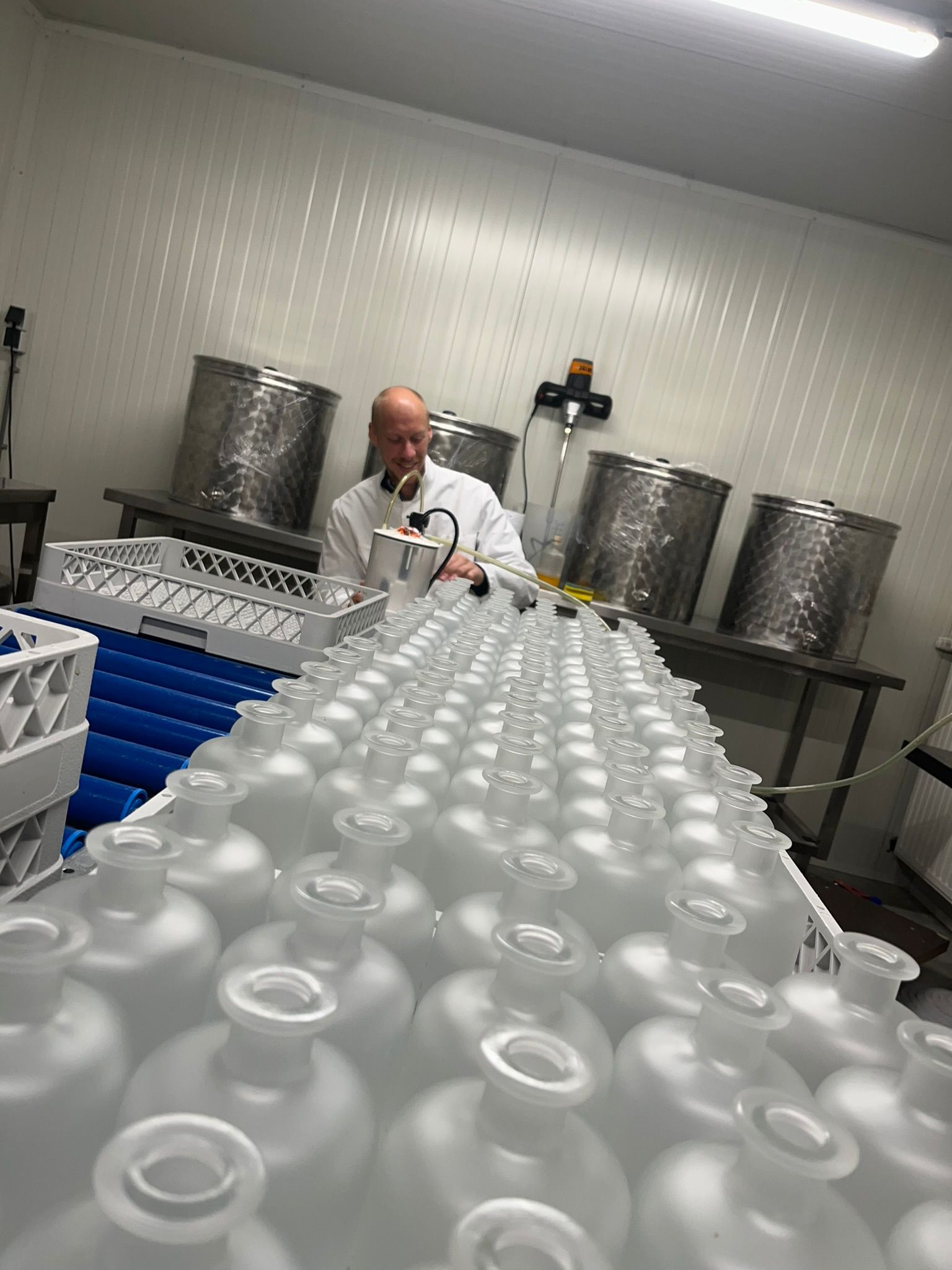 Harm y Simon encontraron su ubicación ideal en Gemert y allí lanzaron Château Gemerre, completo con un espacio de producción y una sala de recepción para clientes. En 2022 pisaron el acelerador: comenzaron colaboraciones con mayoristas y la producción aumentó de tres a siete tanques por lote, lo que suponía unas 1.400 botellas. El etiquetado manual pasó a ser cosa del pasado gracias a una máquina semiautomática, mientras también aprendían a gestionar aduanas e impuestos especiales. A pesar del crecimiento, en los periodos de mayor demanda esto no siempre era suficiente, lo que dejó clara la necesidad de seguir ampliando. Se enfrentaban a una decisión importante: seguir invirtiendo por su cuenta o colaborar con un experto para poder crecer sin límites.